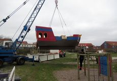 Wie der "fliegende Holländer" ist am Montag ein Piratenschiff am Haken des Krans von Inselspediteur Jan Martin Janssen auf seinen neuen Liegeplatz auf dem Spielgelände vor dem Haus Westwind der AWO LangeoogKlinik geschwebt. Auf fremdem Kiel hatte es zuvor das Wattenmeer überquert. An Bord des Frachtschiffes PIONIER erreichte es die Insel, nachdem es in Bensersiel mit Hilfe eines eines Autokrans auf einen Frachthänger der...