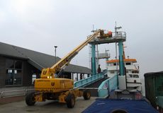 Einen zuletzt ungewohnten Anblick gab es am Montagmorgen im Langeooger Hafen, der schon bald wieder Normalität werden soll. LANGEOOG IV lag an der Containerbrücke, doch noch passt sie nicht. Es wurden vom Vordeck aus vorbereitende Arbeiten für die bevorstehende Sanierung durchgeführt. Unter anderem wurden etwa eine halbe Tonne Metallplatten demontiert und vom Portal mit der Elletrohubzylinder-Anlage aus wurde die Brücke gesteuert.