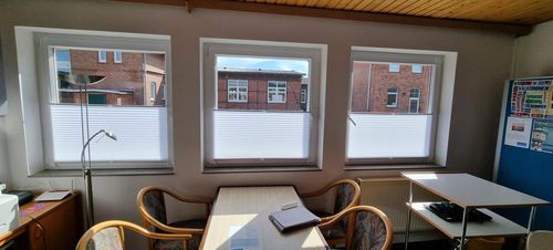 Neue Plissees verbessern die Nutzung der Begegnungsräume des "Treff am Meer. Einer der beiden Begegnungsräume kann nun deutlich besser genutzt werden, an sonnigen Tagen war er nur eingeschränkt nutzbar. Zwar sorgte das viele Tageslicht für eine helle und freundliche Atmosphäre, gleichzeitig heizte sich der Raum aber stark auf, weil ein passender Sonnenschutz fehlte. Zudem ist jetzt auch in den Räumen bei Bedarf mehr Privatsphäre möglich.